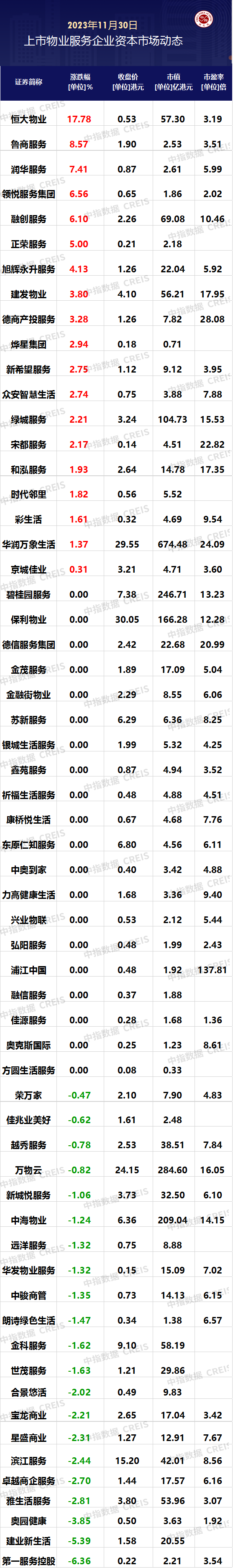 ☞ 戳这里,加入【中指社群】地产/物业/投拓/产城 企业动态 ▌中海物业人事变动 中海物业管理有限公司发生工商变更,总经理杨鸥退出,董事肖俊强职务调整为总经理。 ▌荣万家人事变动 荣万家召开临时股东大会、内资股类别股东大会及H股类别股东大会。据公告,耿建富获委任为第二届董事会董事长;景中华获委任为第二届监事会主席。 11月29日,重点城市新增土地项目数309个,规划建筑面积1623.24万平。其中,新增住宅项目96个,商业办公项目69个,工业项目124个,其他类项目20个。重点关注衡水,新增项目最多为25个。其中规划建筑面积最大的项目是永康现代农业装备高新区330国道以东、321省道以南地块,成交楼面价:2076324㎡,成交楼面价:125元/㎡,开发企业:永康市智锋工贸有限公司。 图:全国重点城市新增土地项目数 ▌物业服务企业二级市场表现 11月30日,恒生指数,收盘上涨49.44点,涨幅为0.29%,报收17042.88点。今日60家港股上市物业服务企业中19家上涨,恒大物业涨幅17.78%,位列今日港股物业服务板块第一位。 ▌物业服务企业市值、市盈率 11月30日,港股60家物业上市企业平均市值为40.68亿港元。截至今日收盘,共有6家物业服务企业总市值超过百亿港元。华润万象生活为在港上市物业服务企业市值最大的公司,总市值为674.48亿港元,万物云为港股物业股第二,总市值为284.60亿港元,碧桂园服务位列港股物业服务企业总市值第三位,总市值为246.71亿港元。从市盈率来看,港股60家物业上市企业平均市盈率为6.76倍。浦江中国市盈率最高,达137.81倍。 “新房改”将至,对楼市影响会有多大? 更多城市报告查询: https://u.fang.com/ysso6r/ ➤物业研究 www.cih-index.com/