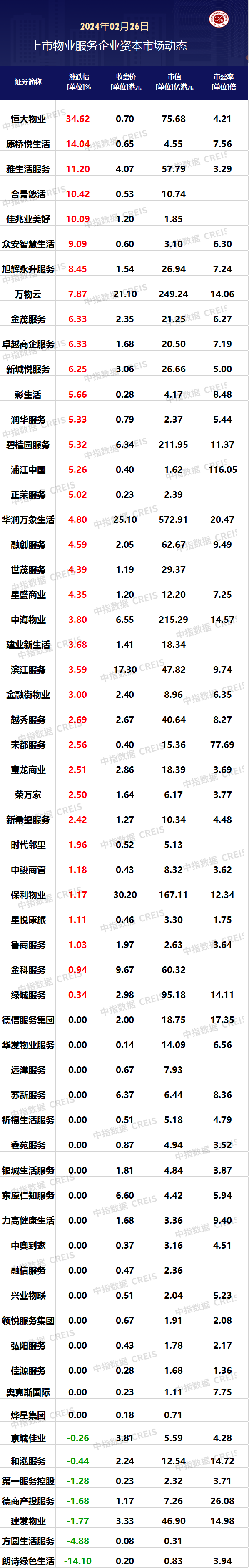 ☞ 戳这里,加入【中指社群】地产/物业/投拓/产城 ▌宏泰物业新设公司 山东宏泰物业发展有限公司新增投资企业珠海宏仁康养服务有限公司,经营范围包括:养老服务;医院管理;母婴生活护理等。 ▌万佳物业人事变动 万佳物业发布公告称,根据有关规定,公司第一届董事会第十三次会议于2024年2月23日审议并通过: 聘任董加报为公司副总经理,任职期限至第一届董事会任职期限届满为止,自2024年2月23日起生效。 https://u.fang.com/ytaard/ 数据来源:中指数据CREIS物业版(点击试用) 市场研究:https://u.fang.com/yt994g/ ▌物业服务企业二级市场表现 2月26日,恒生指数,收盘下跌91.12点,跌幅为0.54%,报收16634.74点。今日60家港股上市物业服务企业中36家上涨,恒大物业涨幅34.62%,位列今日港股物业服务板块第一位。 ▌物业服务企业市值、市盈率 2月26日,港股60家物业上市企业平均市值为38.03亿港元。截至今日收盘,共有5家物业服务企业总市值超过百亿港元。华润万象生活为在港上市物业服务企业市值最大的公司,总市值为572.91亿港元,万物云为港股物业股第二,总市值为249.24亿港元,中海物业位列港股物业服务企业总市值第三位,总市值为215.29亿港元。从市盈率来看,港股60家物业上市企业平均市盈率为6.88倍。浦江中国市盈率最高,达116.05倍。 2023年中国房地产企业销售百亿专题 https://u.fang.com/ys9p6o/ 2023年全国房地产企业拿地TOP100排行榜 https://u.fang.com/ys9p6n/ 中国房地产2023年市场总结&2024年趋势展望 https://u.fang.com/ysbvth/ 中指 | 定了!2024房地产政策如何发力 2023中国房地产行业发展趋势白皮书(限免) https://u.fang.com/ysimad/ 外资并购不动产:注重长期稳健收益,布局新兴物业 https://u.fang.com/ysdby6/ “新房改”将至,对楼市影响会有多大? https://u.fang.com/yshb8q/ ➤物业研究 2023年中国物业服务价格指数研究报告 https://u.fang.com/ysbvte/ 2023年物业企业品牌价值研究报告 https://u.fang.com/ysima5/ 2023中国物业服务满意度研究报告 https://u.fang.com/yskaoy/ 2023中国物业服务百强企业研究报告 https://u.fang.com/ysqj8i/ 2023中国物业服务上市公司TOP10研究报告 https://u.fang.com/ysq5fv/ www.cih-index.com/