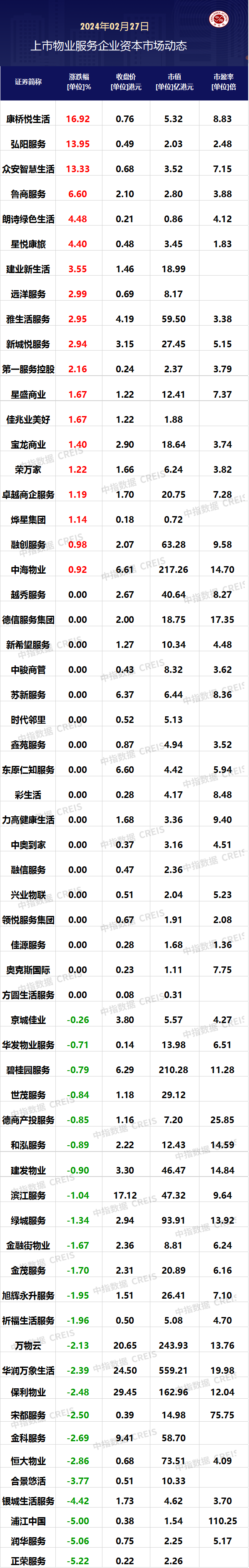 ☞ 戳这里,加入【中指社群】地产/物业/投拓/产城 ▌海珠城发与阿里资产达成战略合作 广州市海珠城发&阿里巴巴国有资产数字化提升战略合作签约仪式近日在琶洲未来产业园举行。海珠城发集团与阿里巴巴集团阿里资产正式签署战略合作协议,双方将共同推进国有资产领域与互联网生态圈的融合,优化国有物业经营管理运作模式,拓展全新业务领域。 ▌城关物业新设物业公司 兰州城关物业服务集团有限公司新设甘肃海淇物业有限公司,经营范围包括物业管理;居民日常生活服务;住宅水电安装维护服务;幼儿园外托管服务;建筑物清洁服务;住房租赁;非居住房地产租赁等。 ▌索克服务拟向金融机构申请综合授信额度 索克服务(832816.NQ)发布公告,为满足生产经营及业务发展的资金需要,2024年索克服务及子公司拟向银行等金融机构申请总额不超过1.1亿元(含)的综合授信额度。 ▌西安广瑞物业人事变动 西安旅游集团广瑞物业服务有限责任公司发生高层人事变动,李慧琴接任监事会主席,于静出任监事。 数据来源:中指数据CREIS物业版(点击试用) 市场研究:https://u.fang.com/yt994g/ ▌物业服务企业二级市场表现 2月27日,恒生指数,收盘上涨156.06点,涨幅为0.94%,报收16790.80点。今日60家港股上市物业服务企业中19家上涨,康桥悦生活涨幅16.92%,位列今日港股物业服务板块第一位。 ▌物业服务企业市值、市盈率 2月27日,港股60家物业上市企业平均市值为37.61亿港元。截至今日收盘,共有5家物业服务企业总市值超过百亿港元。华润万象生活为在港上市物业服务企业市值最大的公司,总市值为559.21亿港元,万物云为港股物业股第二,总市值为243.93亿港元,中海物业位列港股物业服务企业总市值第三位,总市值为217.26亿港元。从市盈率来看,港股60家物业上市企业平均市盈率为6.72倍。浦江中国市盈率最高,达110.25倍。 ➤物业研究 www.cih-index.com/
