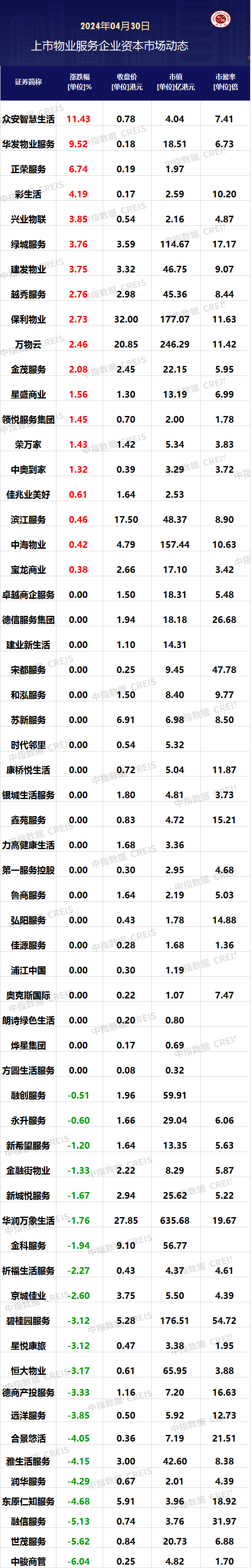 ☞ 戳这里,加入【中指社群】地产/物业/投拓/产城 ▌珠江股份发布一季度报告 珠江股份发布2024年第一季度报告。报告显示,珠江股份在报告期内实现营业收入约3.22亿元;扣除非经常性损益后的净利润则为757.42万元。 ▌新大正发布一季度报告 新大正实现营业收入8.67亿,同比增长19.54%;归属于上市公司股东的净利润为3940.48万元;经营活动产生的现金流量净额为负2.80亿元;基本及稀释每股权益为0.17元/股。 ▌融信服务人事变动 融信服务公布,马祥宏为投入更多时间于彼的其他业务承担,故已提出辞任执行董事及公司行政总裁,执行董事及董事会主席欧国飞已获委任为行政总裁,均自2024年4月29日起生效。 数据来源:中指数据CREIS物业版(点击试用) 市场研究:https://u.fang.com/yt994g/ 数据来源:中指数据CREIS物业版(点击试用) 市场研究:https://u.fang.com/yt994g/ ▌物业服务企业二级市场表现 4月30日,恒生指数,收盘上涨16.12点,涨幅0.09%,报收17763.03点。今日60家港股上市物业服务企业中19家上涨,众安智慧生活涨幅11.43%,位列今日港股物业服务板块第一位。 ▌物业服务企业市值、市盈率 4月30日,港股60家物业上市企业平均市值为37.09亿港元。截至今日收盘,共有6家物业服务企业总市值超过百亿港元。华润万象生活为在港上市物业服务企业市值最大的公司,总市值为635.68亿港元,万物云为港股物业股第二,总市值为246.29亿港元,保利物业位列港股物业服务企业总市值第三位,总市值为177.07亿港元。从市盈率来看,港股60家物业上市企业平均市盈率为7.76倍。碧桂园服务市盈率最高,达54.72倍。 ➤物业研究 www.cih-index.com/