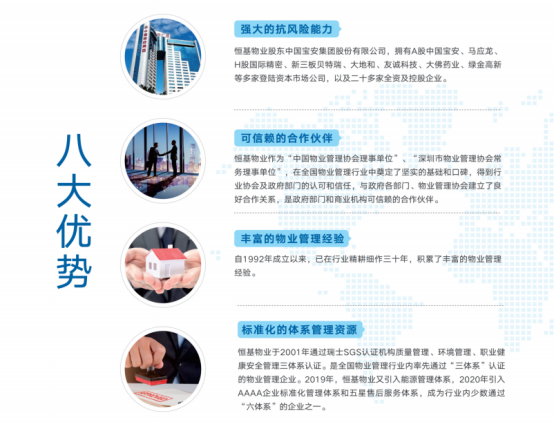 2024年4月18日,由北京中指信息技术研究院主办,北京中指信息技术研究院中国房地产TOP10研究组、中国物业服务指数系统承办的“2024中国物业服务百强企业研究成果发布会暨第十七届中国物业服务百强企业家论坛”于北京隆重举行。研究组以“高品质服务 高质量发展”为主题,在总结以往研究经验的基础上,进一步完善方法体系,从管理规模、经营绩效、服务质量、发展潜力、社会责任等五个方面出发,更加全面、客观地评价企业综合实力。 深圳市恒基物业管理有限公司(以下简称“恒基物业”)凭借强劲的综合实力、高质量的服务品质、优秀的服务口碑,荣获“2019-2024连续六年中国物业服务百强企业”荣誉。 深圳市恒基物业管理有限公司成立于1992年6月19日,注册资金3000万元人民币,总资产近3亿人民币,是创造多项“新中国第一”的中国宝安集团(深证000009)旗下成员企业、金牌物管,现为中国物业管理协会理事单位和深圳市物业管理协会常务理事单位。先后荣获“全国先进物业管理企业”、“全国物业管理100强”、连续多年获得“中国物业服务企业综合实力100强”称号,并自2005年起连续多年跃居“深圳市物业管理综合实力五十强”前列。 三十多年来,通过坚持不懈的市场化运作,恒基物业业务发展遍及广东、海南、云南、江西、湖南、湖北、安徽、江苏、山东、新疆、天津等11个省、直辖市。 恒基物业坚守服务品质,引领行业发展,实现了服务产品与服务体系的迭代升级,从物业设备设施全生命周期管理,到社区生活商务服务体系,再到信息化智慧服务体系,恒基物业不断提供增值服务满足业主需求,同时为合作方赋能,应用完善的服务理论研究体系与最新的信息科技手段,持续丰富物业管理及服务内涵、改善服务方式、提升服务品质、增加人文关怀及客户满意度。 (新疆|宝安·江南城) 恒基物业的八大优势: