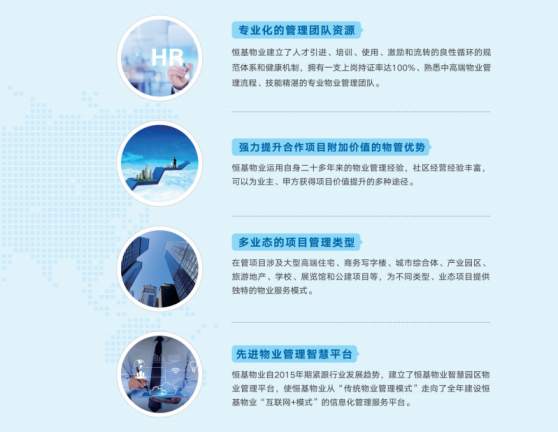 恒基物业已成为中国物业管理行业历史发展的见证者、开拓者和创新者。三十多年来,恒基物业在管理体系、服务体系上不断开拓创新,但“用心做事、真诚服务”的服务理念、“品质优先、精益求精”的管理理念与持续提高客户满意度“以人为本”的服务宗旨始终未变,此宗旨充分体现“360°品牌管家”的恒基品牌核心价值,也为开发商和合作伙伴增加市场价值和品牌价值。