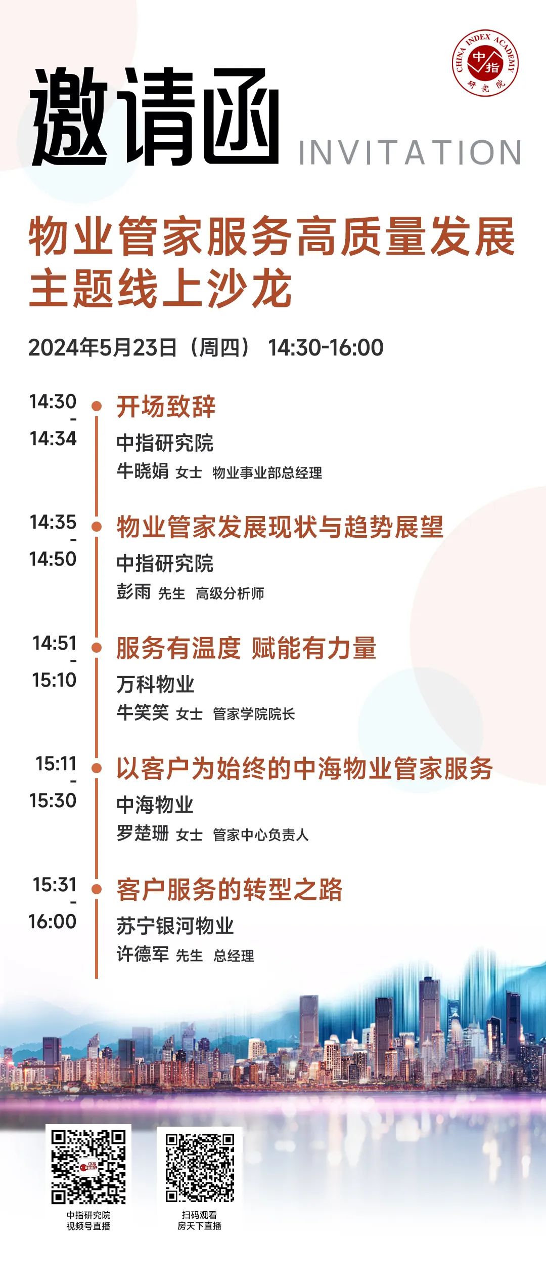 ☞ 直播预约及沙龙资料获取,见文末过去四十余年,随着我国城镇化发展不断深入、居民收入稳步提高和服务业快速发展,人民群众对美好生活的向往愈发强烈。物业服务作为保障人民群众生产、生活环境质量的重要因素之一,服务内容和服务方式也在不断变化、持续精进,特别是“物业管家”的出现,推动了行业服务模式升级。如今,标杆物业企业率先打造了根植于自身文化和服务理念的管家服务体系,向客户提供各具特色的物业管家服务,推动行业呈现出“百花齐放”的管家服务创新格局。中指研究院作为国内研究物业管理行业起步早、历时长的专业智库机构,多年来,持续开展关于物业管理行业发展建设的深度研究。我们发现,部分物业企业的管家服务实践具备一定的领先性,特别是万科物业、龙湖智创生活、保利物业、中海物业、金地物业等物业企业的管家服务建设亮点颇多;但与此同时,我们也发现,不同物业企业对物业管家的战略定位和功能价值存在显著差异,此外,最新版的《中华人民共和国职业分类大典》中,并未将“物业管家”列入职业分类内容。在行业高质量发展过程中,物业管家是见证者更是推动者,如何更好地与客户产生连接,产生共情,产生彼此需要的价值,是所有物业企业正在深入思考的问题。我们相信,物业管家不会止步于成为物业企业常规设置的组织序列,而要真正成长为连接企业、业主、政府以及其它所有相关利益者的核心纽带,更多承担起企业战略落地、客户体验提升以及社会基层治理的重任。中指研究院拟于2024年5月23日14:30-16:00举办『物业管家服务高质量发展主题线上沙龙』,届时将邀请业内知名嘉宾展开深入交流,共同探讨关于物业管家及行业高质量发展相关问题。届时长按海报识别二维码即可实时观看直播识别二维码填写资料预约获取沙龙精粹资料报告下载(电脑端复制链接)2024中国物业服务百强企业研究报告https://u.fang.com/yrtzqd/2024中国物业服务上市公司TOP10研究报告https://u.fang.com/yrt8be/中国物业管理行业2023总结与2024展望https://u.fang.com/ys9hgd/中指研究院2024物业管家发展白皮书https://u.fang.com/yrut8p/2023年中国物业服务价格指数研究报告https://u.fang.com/ysbvte/2023年物业企业品牌价值研究报告https://u.fang.com/ysima5/2023中国物业服务满意度研究报告https://u.fang.com/yskaoy/更多企业研究咨询:https://u.fang.com/ytaard/中指研究院·中指云平台www.cih-index.com/为行业提供:● 4万+房地产报告每日更新,涵盖住宅市场、房企研究、土地市场、物业研究、政策解读、指数研究等诸多领域;● 2300个城市地产数据、225万宗土地的推出成交信息、40万个住宅项目和5万栋商用物业的交易数据;● 中国城市投资吸引力排名,百城房价,查城市、查房企、查地产数据、查房地产政策;● 京津冀、长三角、珠三角、成渝、长江中游等核心城市群集中供地、土地拍卖快讯。戳“阅读原文” 免费试用中指产品!
