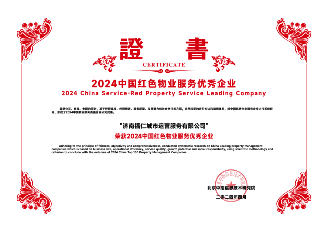 济南福仁城市运营服务有限公司(以下简称福仁服务)凭借持续提升服务品质、不断拓宽服务渠道和物业服务领域的突出表现,荣获“2024中国物业服务百强企业”与“2024中国红色物业服务优秀企业”。
